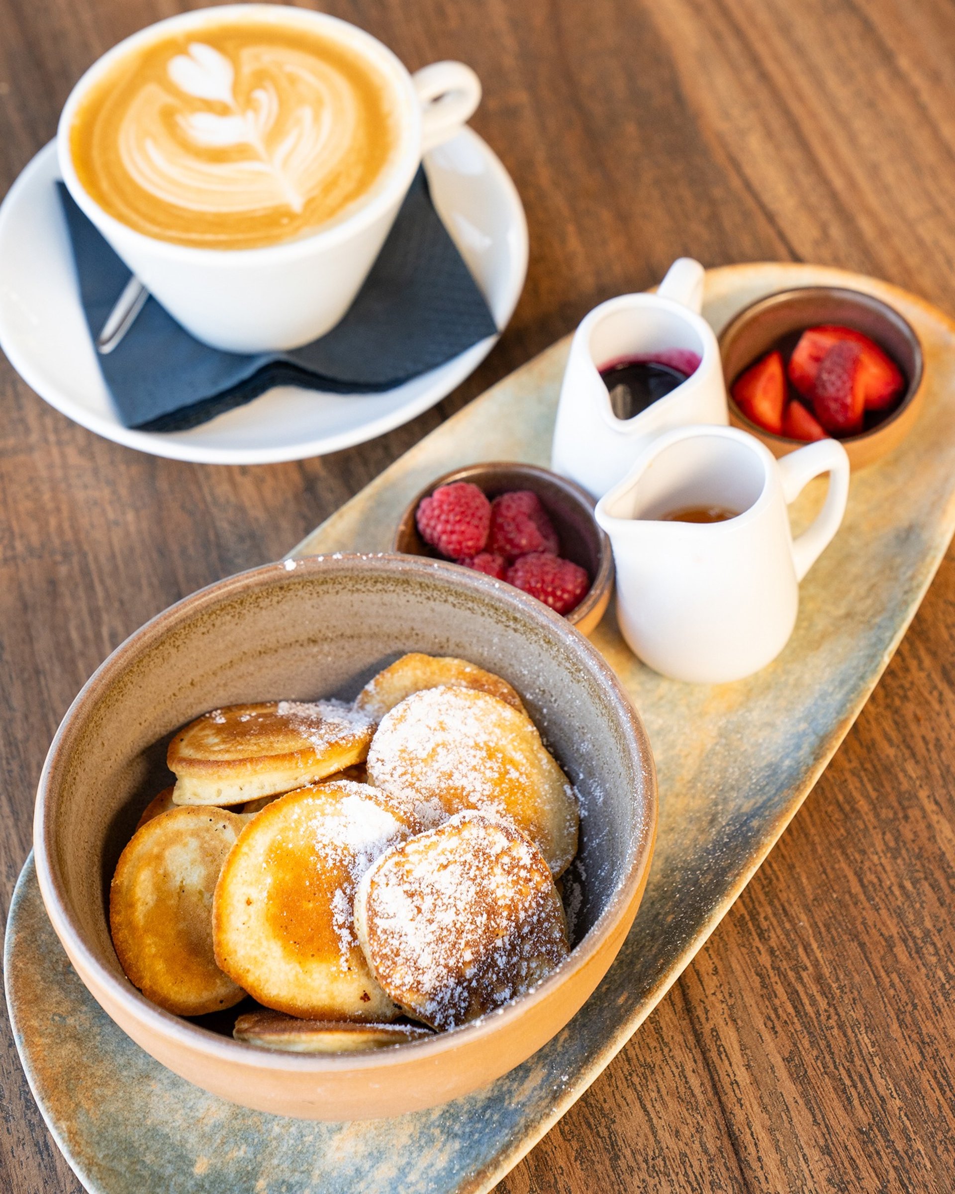 Mini pancakes με φρούτα του δάσους και ζάχαρη άχνη. Συνοδεύεται με μέλι και μαρμελάδα σπιτική από κόκκινα φρούτα.